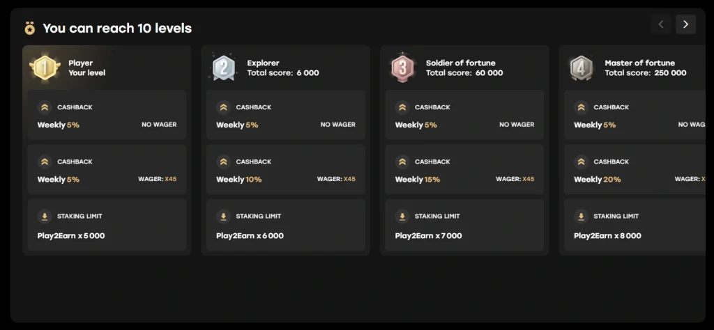 El programa de Fairspin VIP está estructurado en 10 niveles, cada uno ofreciendo beneficios más sustanciales que el anterior. A medida que subes de nivel, tu estatus se eleva y las recompensas se vuelven más exclusivas. El camino hacia la cima está diseñado para ser claro y alcanzable, recompensando tu compromiso de manera constante. El nivel más alto, el «Master of Fortune», ofrece el máximo de beneficios, pero cada nivel intermedio te acerca a tu potencial de ganancias.